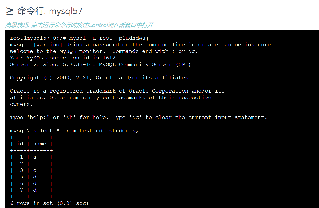 Query OK, 1 row affected (0.001 sec) MySQL [test_cdc]> insert into students values(7,'d');