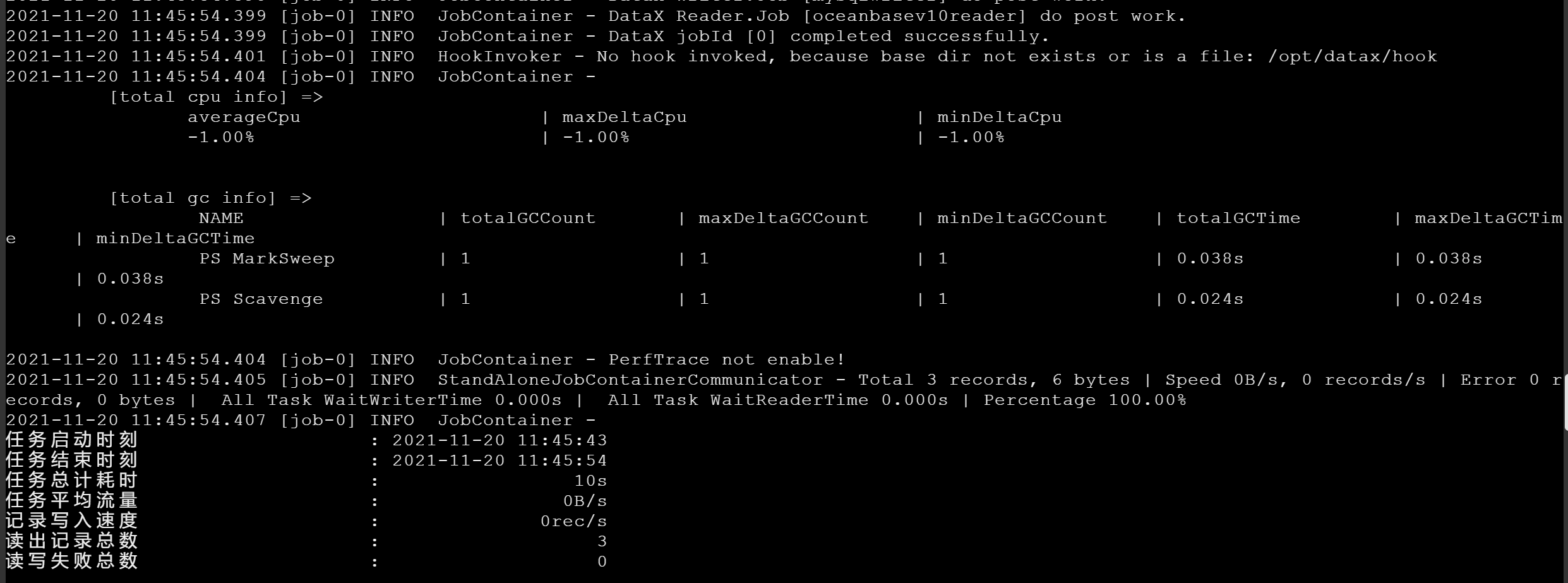 {"job": {"setting": {"speed": {"channel":3},"errorLimit": {"record": 0}},"content": [{"reader": {"name": "oceanbasev10reader","parameter": {"username": "root","password": "123456","column": ["*"],"weakRead": "false","readBatchSize": 30,"connection": [{"jdbcUrl": "jdbc:oceanbase://172.18.128.73:2881/test_cdc","table": ["students"]}]}},"writer": {"name": "mysqlwriter","parameter": {"writeMode": "insert","username": "test_cdc","password": "7jJBHdfjl","column": ["*"],"connection": [{"jdbcUrl": "jdbc:mysql://172.21.10.26:24313/test_cdc","table": ["students"]}]}}}]}