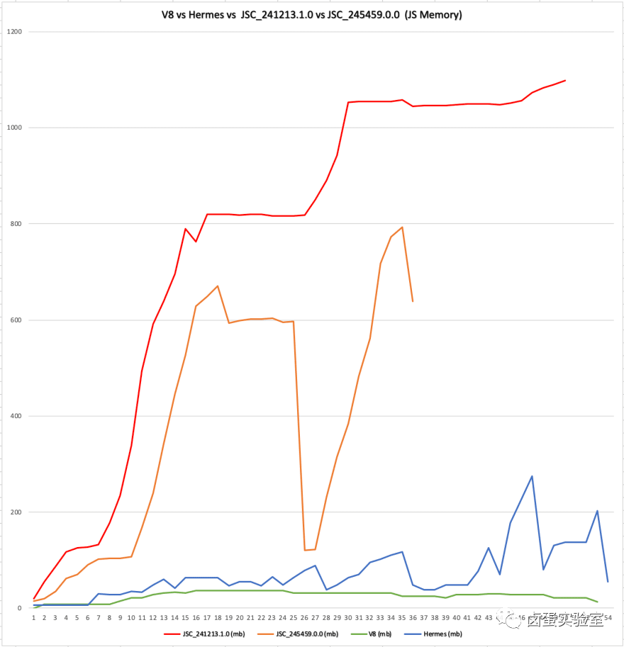 关于详细的 Hermes 性能测试情况,网上有两篇文章写的比较好:一篇是 React Native Memory profiling: JSC vs V8 vs Hermes[17],可以看到在 Android 设备上 Hermes 的表现还是很优异的,而 JSC 的表现非常拉垮: