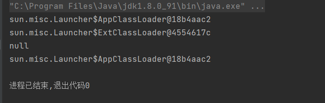 public class test02 {public static void main(String[] args) throws ClassNotFoundException {//获取系统类加载器ClassLoader c=ClassLoader.getSystemClassLoader();System.out.println(c);//获取系统类加载器父类--扩展类加载器ClassLoader parent = c.getParent();System.out.println(parent);//获取根类加载器ClassLoader parent1 = parent.getParent();System.out.println(parent1);//测试当前类是由哪个类加载器加载ClassLoader t = Class.forName("test02").getClassLoader();System.out.println(t);}}