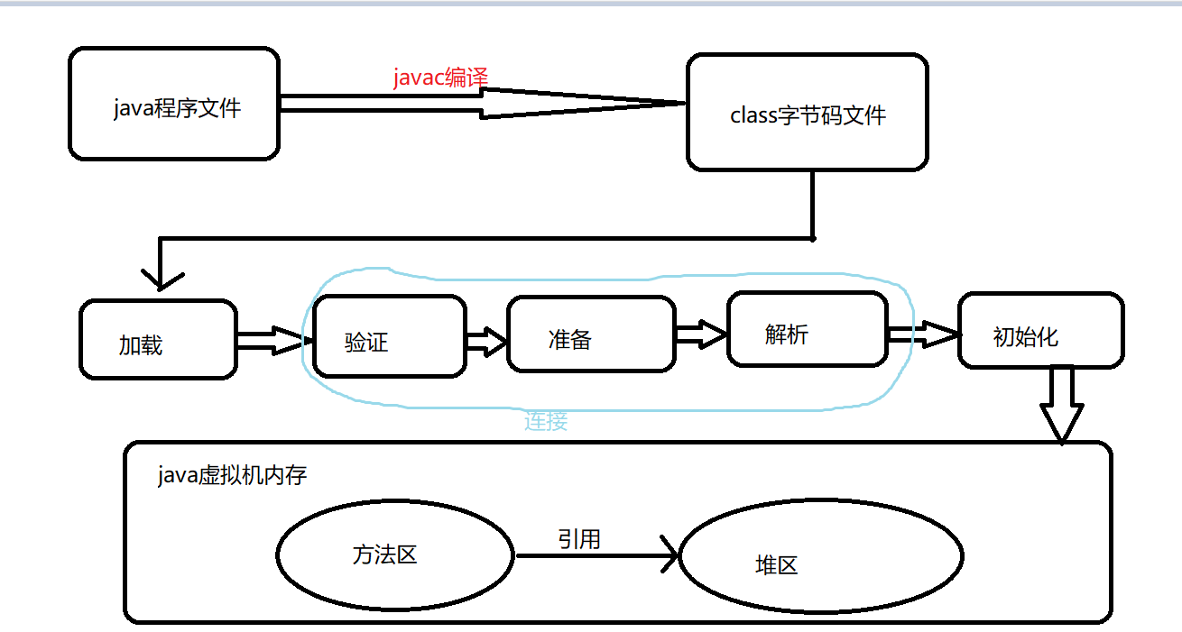 java中源文件通过java编译器产生了字节码文件,而类加载器及时负责将字节码文件加载到内存中。并将这些静态数据转化成方法区中运行时数据结构。然后再堆中生成一个代表个类的class对象,即java.lang.class类对象。