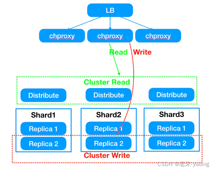不管是多分片还是多副本都是以集群方式部署,那么对外暴露多台Clickhouse服务,通常会通过LB方式使每台服务器能够均匀的接受到客户端的请求,另外一点就是在其中一台服务发生故障,仍然能通过故障转移方式正常对外提供服务。