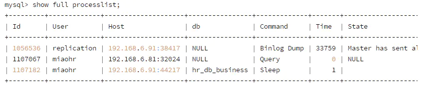 这个命令中最关键的就是state列,mysql列出的状态主要有以下几种: