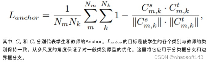 在起始点检测框架中,我们将每个像素视为一个单独的样本,其中每个像素都拥有足够的信息来支持以下分类和定位回归任务。同样,样本在嵌入空间中分散,且与Structured knowledge distillation之间存在相关性。这里不是建模所有像素之间的密集相关性,而是测量像素和类别Anchor之间的距离。这些距离构建了一个拓扑结构,用于根据Anchor来校准单个样本。训练有素的教师对距离有更精确的测量方法。因此,它规范了学生的拓扑结构。作者设计了学生和教师之间的拓扑距离蒸馏损失为: