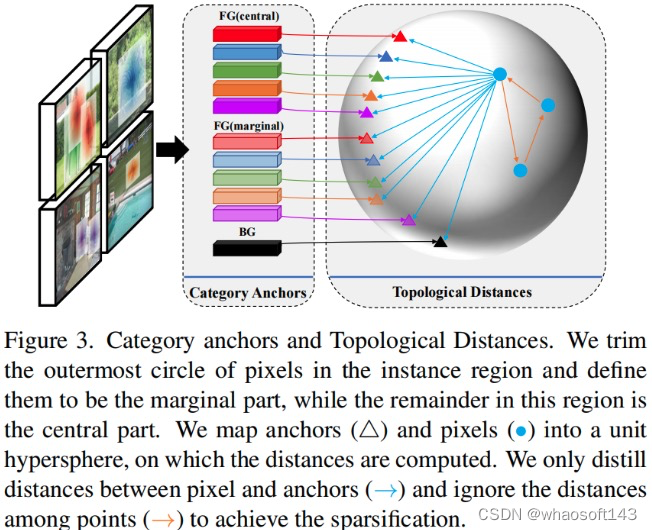 为此,作者将空间像素表示映射到一个单位超球体中,其中保留了与附近元素的空间局部相似性,而不失去对那些具有明显特征的元素的识别能力。这里不是测量所有元素之间的关系,而是只量化这些元素和类别Anchor之间的距离。它允许大量毫无意义的关系被丢弃,并自动完成稀疏化。作者将这种策略命名为拓扑距离蒸馏法(_Topological Distance Distillation_)。