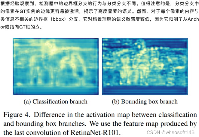 如图4所示,bbox特征图在图像中具有更被激活的像素,这实际上表明了它自身和GT中心之间的相对位置。受此发现的启发在空间域建立了分布对齐模型,并有效KL散度损失将bbox层提取为:whaosoft aiot http://143ai.com