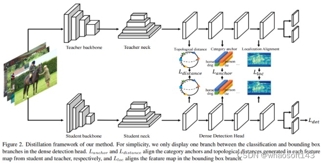 在本节中介绍了整体蒸馏管道,该管道由类别Anchor蒸馏、拓扑距离蒸馏和定位分布对齐组成。类别Anchor表示从多尺度特征图中挖掘的全局类别信息。它描述了语义原型和单个像素之间的分布,而不会受到类间不平衡的不利影响。因此,在潜在嵌入空间中可以更好地说明拓扑距离。定位分布对齐有效地利用分布匹配损失来提取从教师到学生的回归特征图,其中像素在空间相对位置上表现出语义。