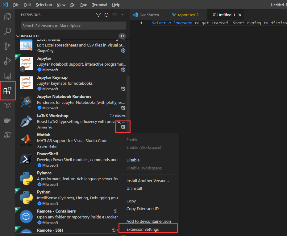 在 Extention 列表中找到 Latex Workshop 插件,点选齿轮状图标,打开扩展设置(Extension Settings)。