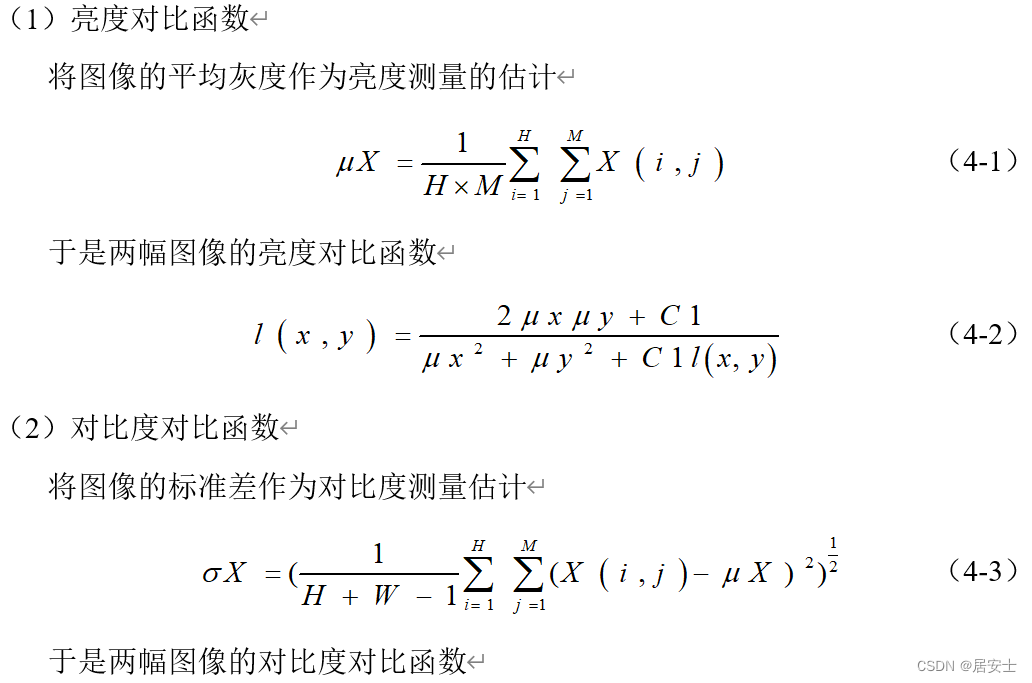 (1)SSIM指数:SSIM测量系统由三个对比模块组成,分别是亮度、对比度、结构。