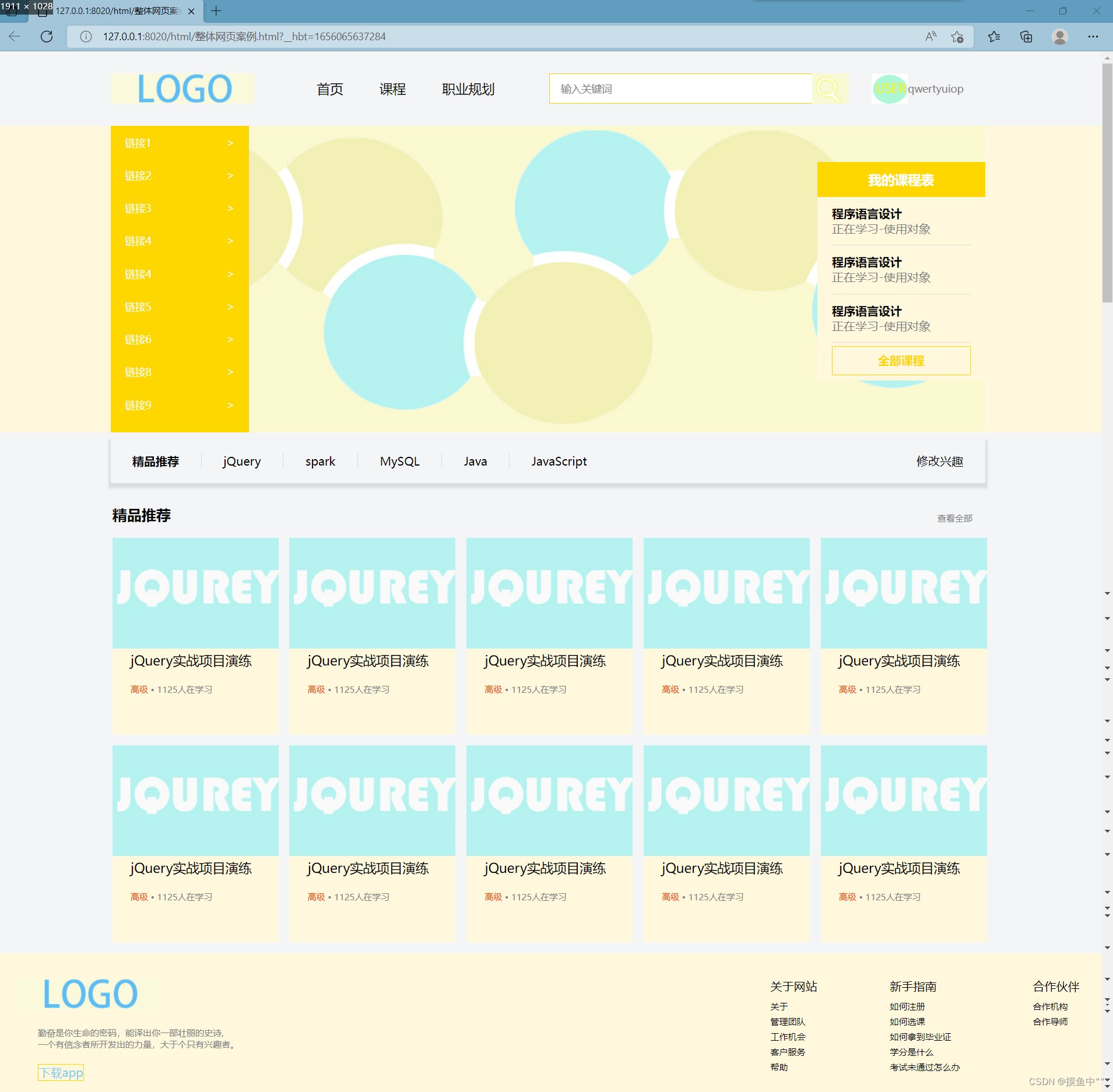 <html><head><meta charset="UTF-8"><title></title><link rel="stylesheet" href="css/整体网页案例.css" /></head><body><div class="header"><!--logo--><div class="logo"><img src="img/logo.jpg" alt="logo" /></div><!--导航栏--><div class="nav"><ul><li><a href="#">首页</a></li><li><a href="#">课程</a></li><li><a href="#">职业规划</a></li></ul></div><!--搜索--><div class="search"><input type="text" value="输入关键词"/><button></button></div><!--用户--><div class="user"><img src="img/用户.jpg" alt="user" /><span>qwertyuiop</span></div></div><div class="banner"><!--链接--><div class="w"><div class="subnav"><ul><li><a href="#">链接1<span>></span></a></li><li><a href="#">链接2<span>></span></a></li><li><a href="#">链接3<span>></span></a></li><li><a href="#">链接4<span>></span></a></li><li><a href="#">链接4<span>></span></a></li><li><a href="#">链接5<span>></span></a></li><li><a href="#">链接6<span>></span></a></li><li><a href="#">链接8<span>></span></a></li><li><a href="#">链接9<span>></span></a></li></ul></div><!--课程表--><div class="course"><h2>我的课程表</h2><div class="bd"><ul><li><h4>程序语言设计</h4><p>正在学习-使用对象</p></li><li><h4>程序语言设计</h4><p>正在学习-使用对象</p></li><li><h4>程序语言设计</h4><p>正在学习-使用对象</p></li></ul><a href="#" class="more">全部课程</a></div></div></div></div><!--兴趣--><div class="goods"><h3>精品推荐</h3><ul><li><a href="#">jQuery</a></li><li><a href="#">spark</a></li><li><a href="#">MySQL</a></li><li><a href="#">Java</a></li><li><a href="#">JavaScript</a></li></ul><a href="#" class="mod">修改兴趣</a></div><!--产品模块--><div class="box"><div class="box-hd"><h3>精品推荐</h3><a href="#">查看全部</a></div><div class="box-bd"><ul class="clearfix"><li><img src="img/产品.jpg" alt="" /><h4>jQuery实战项目演练</h4><div class="info"><span>高级</span> • 1125人在学习</div></li><li><img src="img/产品.jpg" alt="" /><h4>jQuery实战项目演练</h4><div class="info"><span>高级</span> • 1125人在学习</div></li><li><img src="img/产品.jpg" alt="" /><h4>jQuery实战项目演练</h4><div class="info"><span>高级</span> • 1125人在学习</div></li><li><img src="img/产品.jpg" alt="" /><h4>jQuery实战项目演练</h4><div class="info"><span>高级</span> • 1125人在学习</div></li><li><img src="img/产品.jpg" alt="" /><h4>jQuery实战项目演练</h4><div class="info"><span>高级</span> • 1125人在学习</div></li><li><img src="img/产品.jpg" alt="" /><h4>jQuery实战项目演练</h4><div class="info"><span>高级</span> • 1125人在学习</div></li><li><img src="img/产品.jpg" alt="" /><h4>jQuery实战项目演练</h4><div class="info"><span>高级</span> • 1125人在学习</div></li><li><img src="img/产品.jpg" alt="" /><h4>jQuery实战项目演练</h4><div class="info"><span>高级</span> • 1125人在学习</div></li><li><img src="img/产品.jpg" alt="" /><h4>jQuery实战项目演练</h4><div class="info"><span>高级</span> • 1125人在学习</div></li><li><img src="img/产品.jpg" alt="" /><h4>jQuery实战项目演练</h4><div class="info"><span>高级</span> • 1125人在学习</div></li></ul></div></div><!--底部--><div class="footer"><div class="t"><div class="copyleft"><img src="img/logo.jpg" alt="logo" /><p>勤奋是你生命的密码,能译出你一部壮丽的史诗,<br />一个有信念者所开发出的力量,大于个只有兴趣者。</p><a href="#" class="app">下载app</a></div><div class="linksright"><dl><dt>关于网站</dt><dd><a href="#">关于</a></dd><dd><a href="#">管理团队</a></dd><dd><a href="#">工作机会</a></dd><dd><a href="#">客户服务</a></dd><dd><a href="#">帮助</a></dd></dl><dl><dt>新手指南</dt><dd><a href="#">如何注册</a></dd><dd><a href="#">如何选课</a></dd><dd><a href="#">如何拿到毕业证</a></dd><dd><a href="#">学分是什么</a></dd><dd><a href="#">考试未通过怎么办</a></dd></dl><dl><dt>合作伙伴</dt><dd><a href="#">合作机构</a></dd><dd><a href="#">合作导师</a></dd></dl></div></div></div></body>
