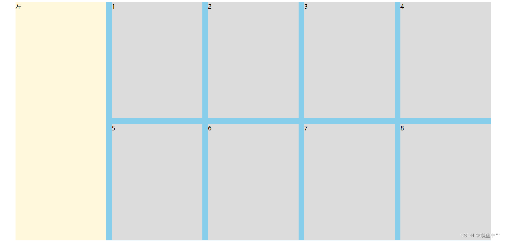 <html><head><meta charset="UTF-8"><title></title><style>.box{width: 1226px;height: 615px;background-color: deepskyblue;margin: 0 auto;}.left{float: left;width: 234px;height: 615px;background-color: cornsilk;}.right{float: left;width: 992px;height: 615px;background-color: skyblue;}.right>div{width: 234px;height: 300px;background-color: gainsboro;float: left;margin-left: 14px;margin-bottom: 14px;}</style></head><body><div class="box"><div class="left">左</div><div class="right"><div>1</div><div>2</div><div>3</div><div>4</div><div>5</div><div>6</div><div>7</div><div>8</div></div></div></body>