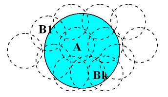 有一开区间族B(B1到Bk的并)覆盖了闭区间A,那么可以在B中选出有限个开区间(虚线小圆)来覆盖A。