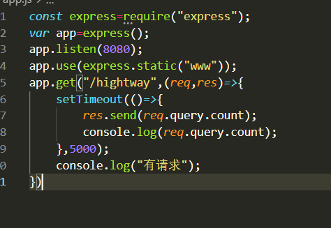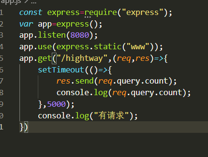 有人请求就打印(有请求),5秒后相应请求,并打印请求结果