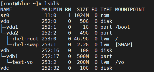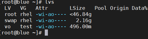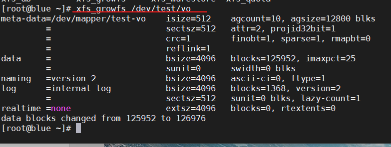 - xfs_growfs /dev/test/vo 适用于xfs系统或者resize2fs /dev/test/vo 适用于xfs系统,可以先进行查看什么格式blkid (挂载目录)