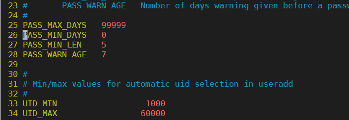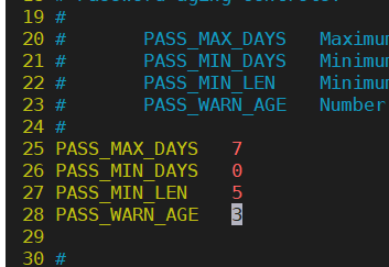 - 第一个代表密码的时候时间、第二个代表密码修改最小间隔、第三个是最小可接受的密码长度、第四个是在密码过期之前给出警告的天数