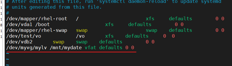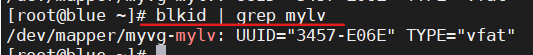 3)使用 vfat 文件系统将逻辑卷 mylv 格式化 4)此逻辑卷应当在系统启动时自动挂载到/mnt/mydata 目录下