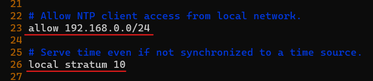 - etc/chrony.conf 的配置文件任意行添加要同步的主机端,其他的都注释掉