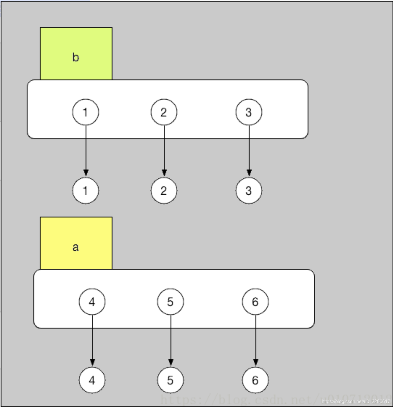 而在此过程当中,a 和 b 都没有动,他们还贴在那个物品上。因此自然 a b 的值都变成了 [4, 5, 6]。