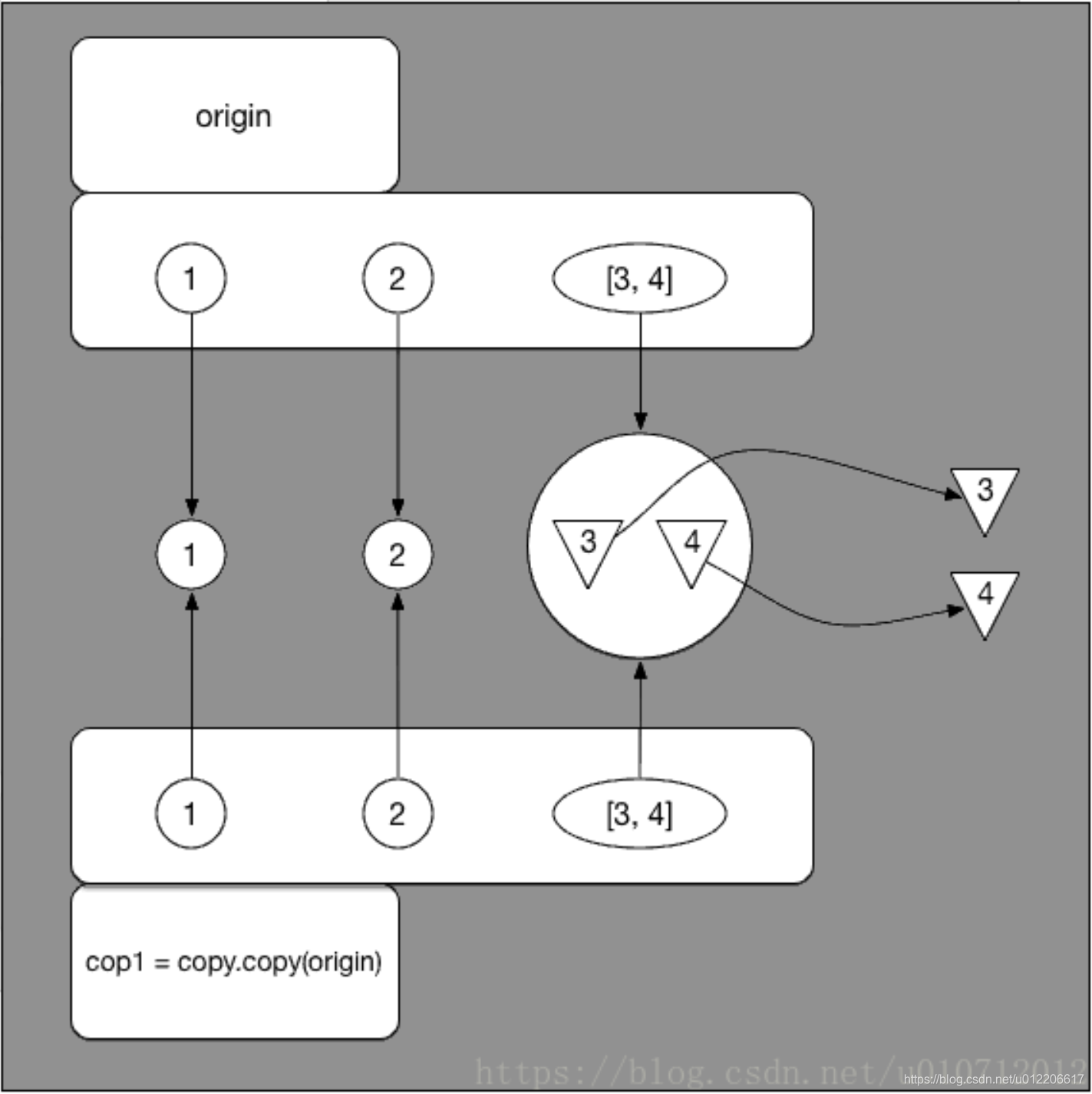 所以说看这里的origin[2],也就是 [3, 4] 这个 list。根据 shallow copy 的定义,在 cop1[2] 指向的是同一个 list [3, 4]。那么,如果这里我们改变了这个 list,就会导致 origin 和 cop1 同时改变。这就是为什么上边 origin[2][0] = “hey!” 之后,cop1 也随之变成了 [1, 2, [‘hey!’, 4]]。
