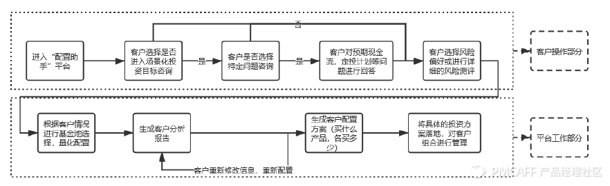 从主流程上而言(如下图),我们将上述三大咨询功能包装成两大咨询功能接口,即“配置助手”和“智能选基”。