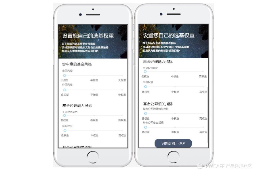 基于该功能目标人群为已经有过基金购买经验的人,因此我们选基过程可以相对更侧重于简便性设计,将所有的指标集中至三大板块,用不超过六个滑块来了解客户看中的基金特征。基金风格滑块为离散型滑块,只有三个选项可供选择,客户填写后,可将基金风格指标转化为产品端对应的晨星基金风格箱的信息。