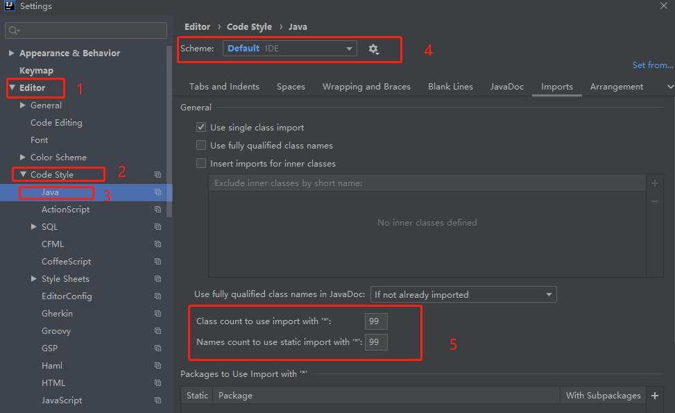 2.将Names count to use static import with ‘*’ (意思与上面相同,不过这是静态导入)的值改为99
