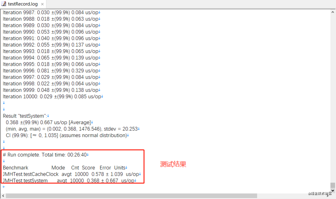 public class JMHTest {public static void main(String[] args) throws RunnerException {testNTime(10000);}private static void testNTime(int num) throws RunnerException {Options options = new OptionsBuilder().include(JMHTest.class.getSimpleName()).measurementIterations(num).output("E://testRecord.log").build();new Runner(options).run();}/*** System.currentMillisTime测试* @return 将结果返回是为了防止死码消除(编译器将 无引用的变量 当成无用代码优化掉)*/@Benchmarkpublic long testSystem() {return System.currentTimeMillis();}/*** 缓存时钟测试* @return*/@Benchmarkpublic long testCacheClock() {return JMHTest.CacheClock.currentTimeMillis();}/*** 缓存时钟,缓存System.currentTimeMillis()的值,每隔1s更新一次*/public static class CacheClock{private static ScheduledExecutorService timer = new ScheduledThreadPoolExecutor(1);private static volatile long timeMilis;static {timer.scheduleAtFixedRate(new Runnable() {@Overridepublic void run() {timeMilis = System.currentTimeMillis();}},0,1000,TimeUnit.MILLISECONDS);}public static long currentTimeMillis() {return timeMilis;}}