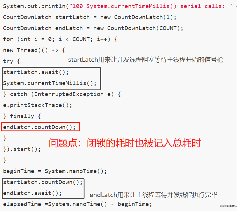 这个测试代码的问题在于闭锁endLatch.countDown的耗时也被算进总体耗时了,闭锁是基于CAS实现的,在当前这样的计算密集型场景下,大量线程一拥而上,几乎都会因CAS失败而被挂起,大量线程挂起、排队、放下的耗时可不是小数目。