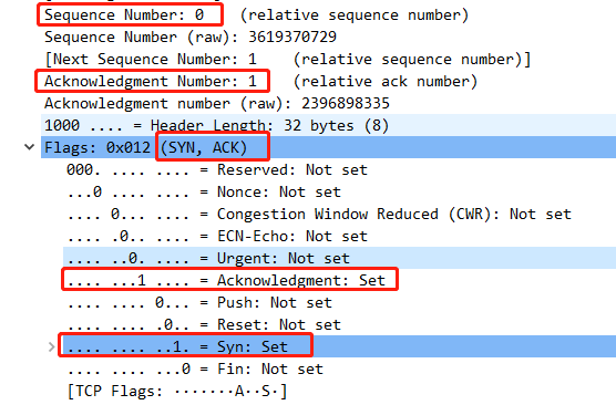 服务端返回SYN+ACK,并且包含服务端的一个初始序列号seq=0,同时返回一个确认号ack=1