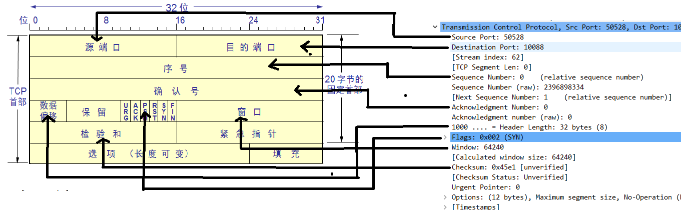 第一次握手:客户端向服务器发送一个SYN段(表示发起连接请求),并且包含客户端的一个初始序列号seq=0