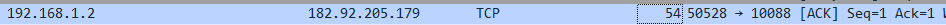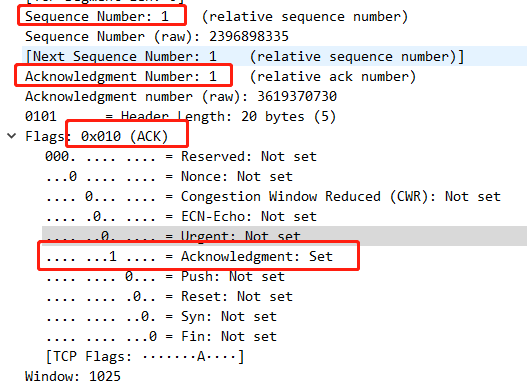 客户端返回一个ACK,并且返回一个确认号ack=1,并且将自己的序列号seq更新为1