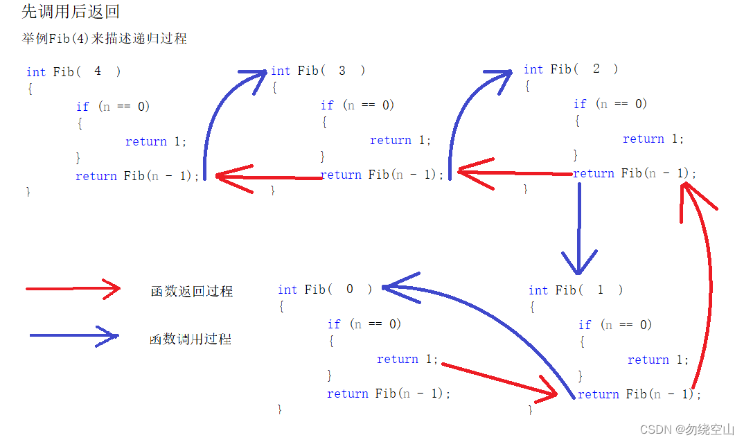 为了更加具体地描述递归过程及递归过程中栈地应用,方便读者理解,这里给出一个具体递归函数,通过具体案例描述递归过程: