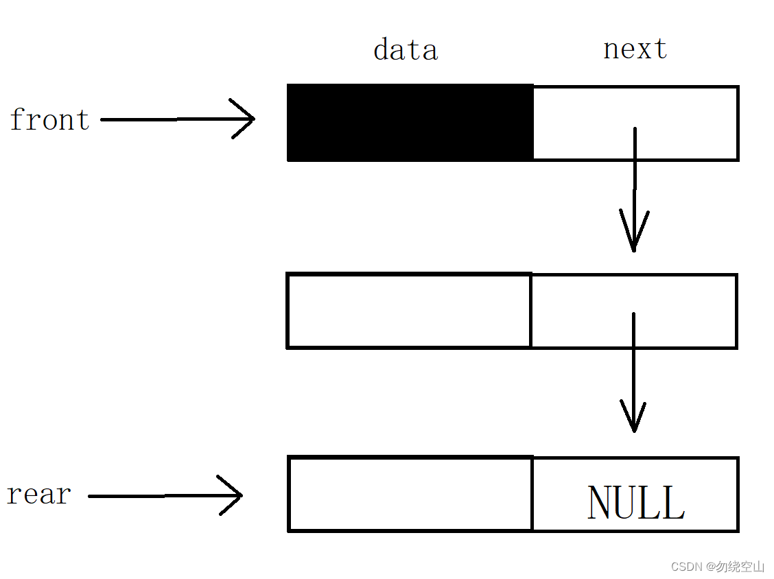 {assert(q);QueueNode* newNode = BuyNewNode(data);if (q->front == NULL) //此时队列为空{q->front = q->rear = newNode;}{q->rear->next = newNode;q->rear = newNode;}