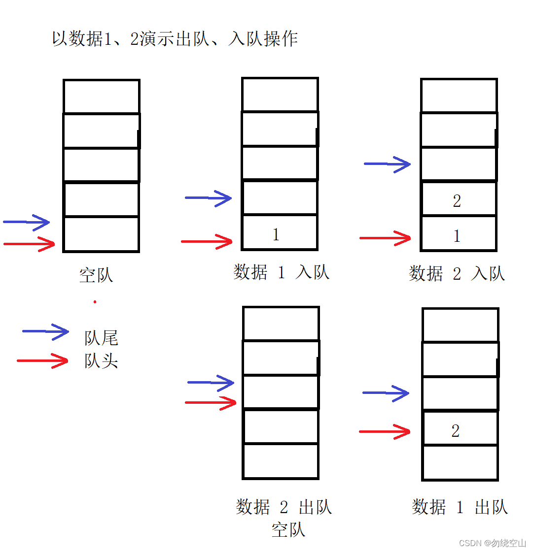 队列的出队、入队操作示意图:(此处只做逻辑解释,不涉及具体存储结构)