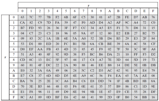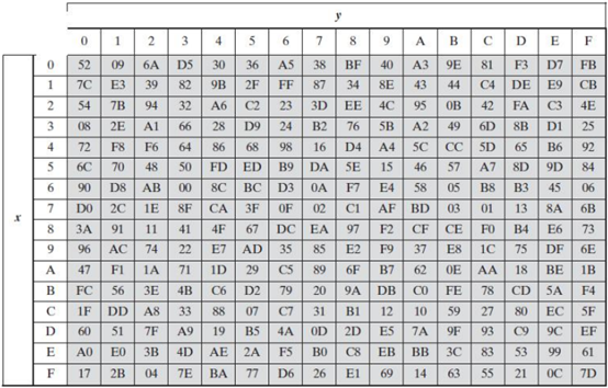 例如:字节0x19代替后的值为S(0x19)=S[0x1][0x9]=0xD4;再通过S-1即可替换为原来的值,S-1(0xD4)= S-1 [0xD][0x4]=0x19。