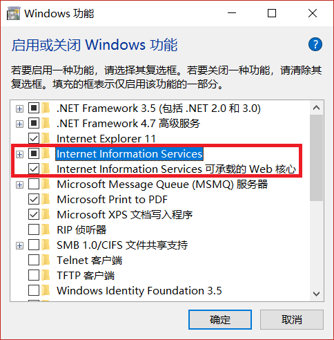 同上图,只需对Windows功能那幅图片红框内的两项勾选上,确定后即可安装IIS服务.