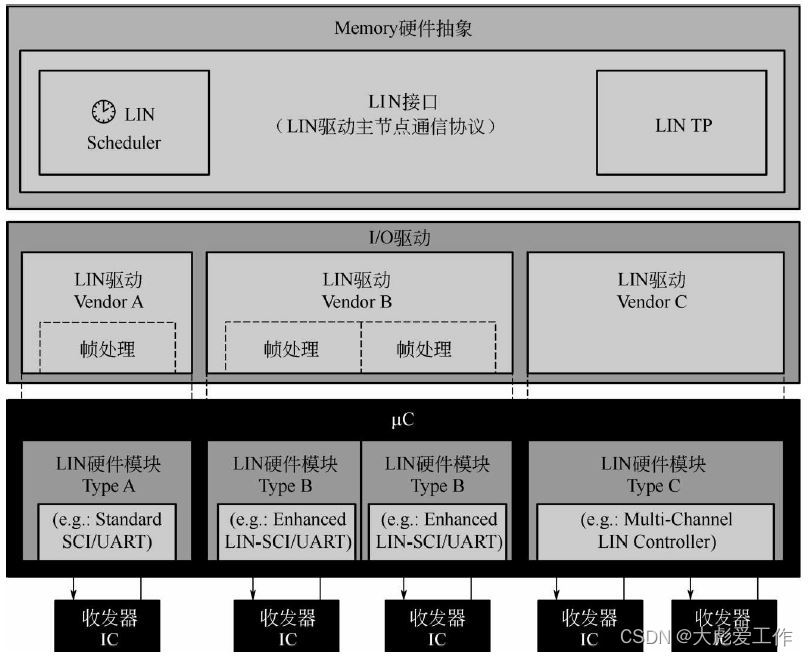 LIN驱动直接访问MCU硬件模块,支持在同一个LIN硬件模块里的多通道LIN通信,提供独立的API函数供上层软件调用。
