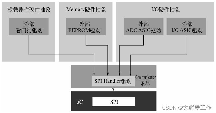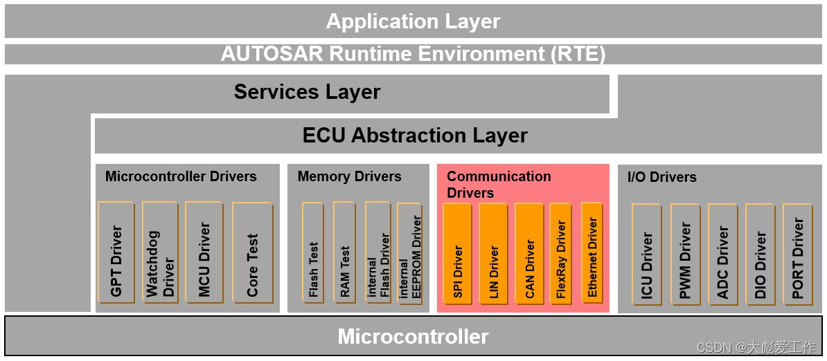 Communication驱动组提供对ECU板载通信外设的(如SPI等)的初始化和控制功能,以及对汽车网络的通信外设(如CAN等)的初始化和控制功能,主要包括SPI驱动(SPI)、LIN驱动(LIN)、CAN驱动(CAN)、FlexRay驱动(FR)、以太网驱动(ETH)。