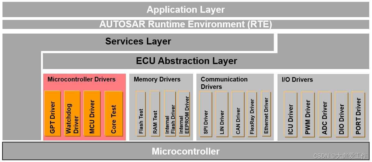 AUTOSAR规范根据MCU底层驱动功能的相似性,把MCAL抽象为4个驱动组,分别是微控制器驱动组(Microcontroller DriversGroup)、存储器驱动组(Memory Drivers Group)、通信驱动组(Communication Drivers Group)、输入/输出驱动组(I/O DriversGroup)。将结构示意图更进一步划分,如下图所示。