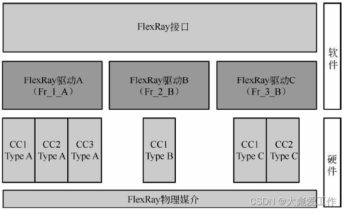 芯片厂商根据FlexRay协议标准设计了FlexRay通信控制器(FlexRay Communication Controller,FlexRay CC),而FR驱动则抽象了FlexRay CC的硬件实现,也就是说FlexRay CC的特性都被囊括在了FR驱动中。对FlexRay CC一系列的访问被抽象成了统一的接口(API),上层软件模块只能通过这些接口来访问FlexRay CC。一个FR驱动可以支持多个FlexRay CC,但这些FlexRay CC必须为同一种硬件实现类型。作为FR驱动的调用者,FlexRay接口(FlexRay Interface,FrIf)模块与底层FlexRay CC完全独立,而且FR驱动中没有主要功能函数(Main-Function)和中断服务函数(ISR),所有FR驱动的API函数仅在FrIf模块中运行。每个FR驱动都被分配唯一的前缀,FrIf模块通过这些命名规则来访问不同的FlexRay CC。