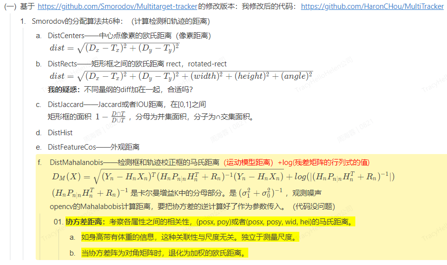 运动模型距离 马氏距离,来自检测-跟踪的kalman校正距离,马氏距离==二维高斯分布,利用相关可以去除维度间的量纲影响,并考虑维度间的相关性。比如x,y,a,h四者的相关性和量纲差异,可以不被考虑。 - 距离矩阵的分配算法——匈牙利算法Hungarian,这里指的是Kuhn&Munkres Hungarian, KM匈牙利算法(加权的匈牙利算法)