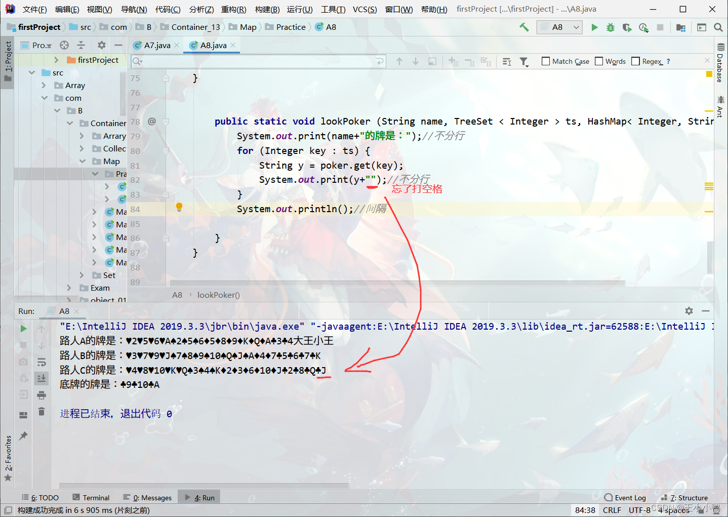 //导入大小王,存入编号poker.put(index, "大王");list.add(index);index++;//编号自增poker.put(index, "小王");list.add(index);//54张牌0-53编号,满了//洗牌(洗的是编号index),用Collections的shuffle()方法实现Collections.shuffle(list);//发牌:将每个人以及底牌设计,将最后3张牌直接存放于底牌,剩余牌通过对3取模依次发牌给3个玩家。