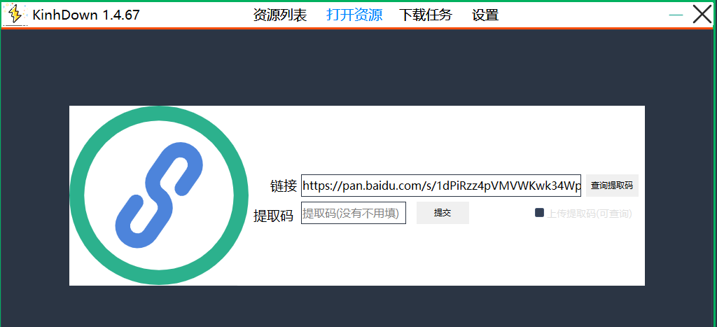 若需下载度盘资源,直接点击顶部的打开资源按钮,将自己需要下载的度盘文件和链接粘贴到框中,然后提交即可