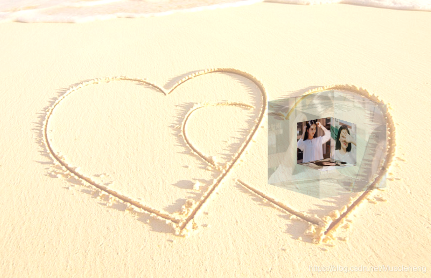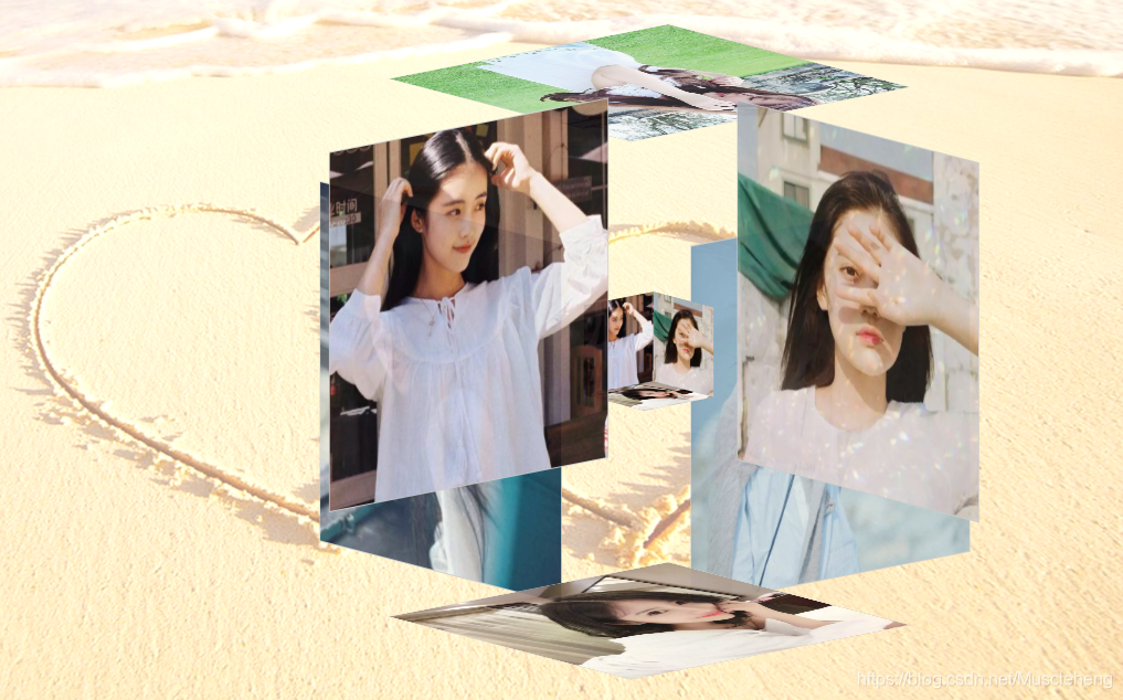 这几天无聊,看到有博主弄的电子相册有点意思,就照葫芦画瓢也实现了一个,一个半透明的正方体包含着一个小正方体,相册自动旋转,当获得焦点时变化效果,截图如下: