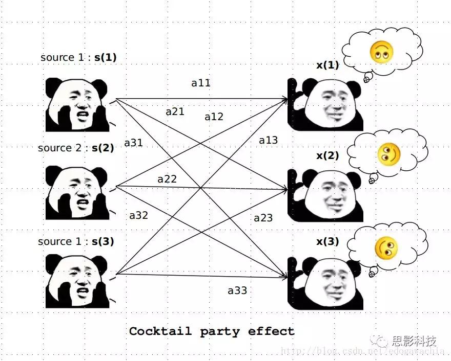 我们在听力上与生俱来就有从混合信号中提取源信号的能力。设想你身处一个热闹的鸡尾酒会,各路名流谈笑风生,孩童嬉戏打闹,顶级乐队高山流水,这时候隔壁工地的工头在远处喊了一声你的名字:李狗蛋!瞬间就穿透其他声音传入你的耳朵,你只好悻悻回去,在工头的呵斥下与赛琳娜告别,悻悻回去搬砖。这就是鸡尾酒会效应(英语:cocktail party effect),它指人的一种听力选择能力,在这种情况下,注意力集中在某一个人的谈话之中而忽略背景中其他的对话或噪音。该效应揭示了人类听觉系统中令人惊奇的能力,使我们可以在噪声中谈话。在数学上,我们将一系列混合信号解码成一系列源信号的方法叫做盲源分离(BSS,blind source seperation),而独立成分分析(ICA,independent component analysis)就是一种典型的盲源分离的方法。