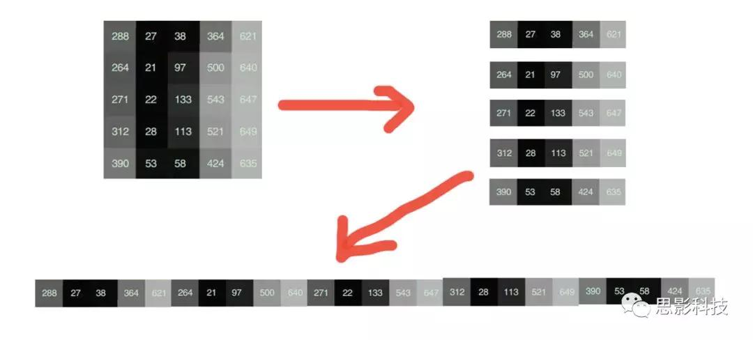 接下来就是ICA在fMRI中的应用了。由第十期大话脑成像我们知道,fMRI数据是一个四维数据(三维空间加一维的时间);由于四维空间比较难以想象,为了便于想象,我们先以下图的方式将一个三维的矩阵重新排列成一个一维的向量。