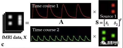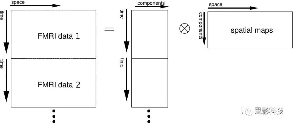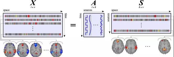 假设我们包含v个体素fMRI数据,时间点为t个,该数据包含k个相互独立源信号,我们的四维fMRI数据就可以表示成一个时间(time)*空间(space)的t*v的二维矩阵,在ICA中,这也是我们的观测信号矩阵x(下图等式最左);而我们要求解的源信号s矩阵则为源信号成分(source)*空间(space)的k*v的矩阵(下图等式最右),即每个成分的空间分布图;而每个成分的时间序列,即时间(time)*源信号成分(source)的t*k的矩阵(下图等式最右),则为混合矩阵A。