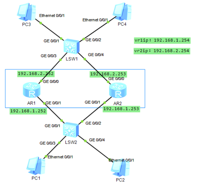 interface GigabitEthernet0/0/1ip address 192.168.1.252 255.255.255.0 vrrp vrid 1 virtual-ip 192.168.1.254