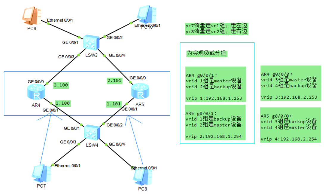 interface GigabitEthernet0/0/0ip address 192.168.2.252 255.255.255.0 vrrp vrid 2 virtual-ip 192.168.2.254路由器连接的网段里的终端设备网关都是这个虚拟ip,一旦master设备出故障,backup设备就会变成master设备转发数据,实际上两个设备只从master设备转发数据