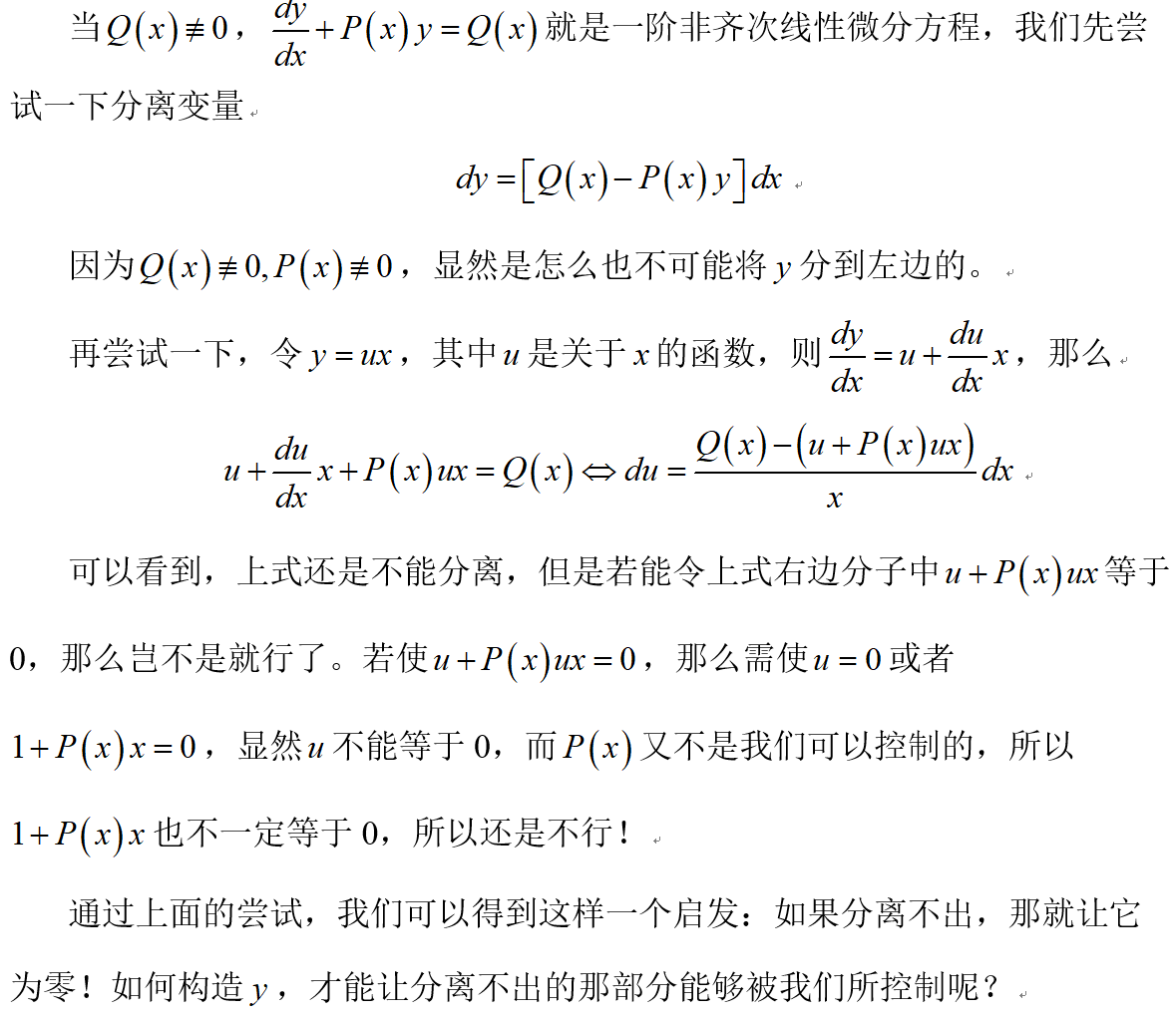 笔者是在学习微分方程的时候,对“一阶非齐次线性微分方程解的结构”中所使用的常数变易法存在些许疑问,一路追查,读了上面的文章,才大致搞清楚常数变易法的来历。下面从一阶非齐次线性微分方程的求解出发,慢慢将常数变易法给呈现出来。